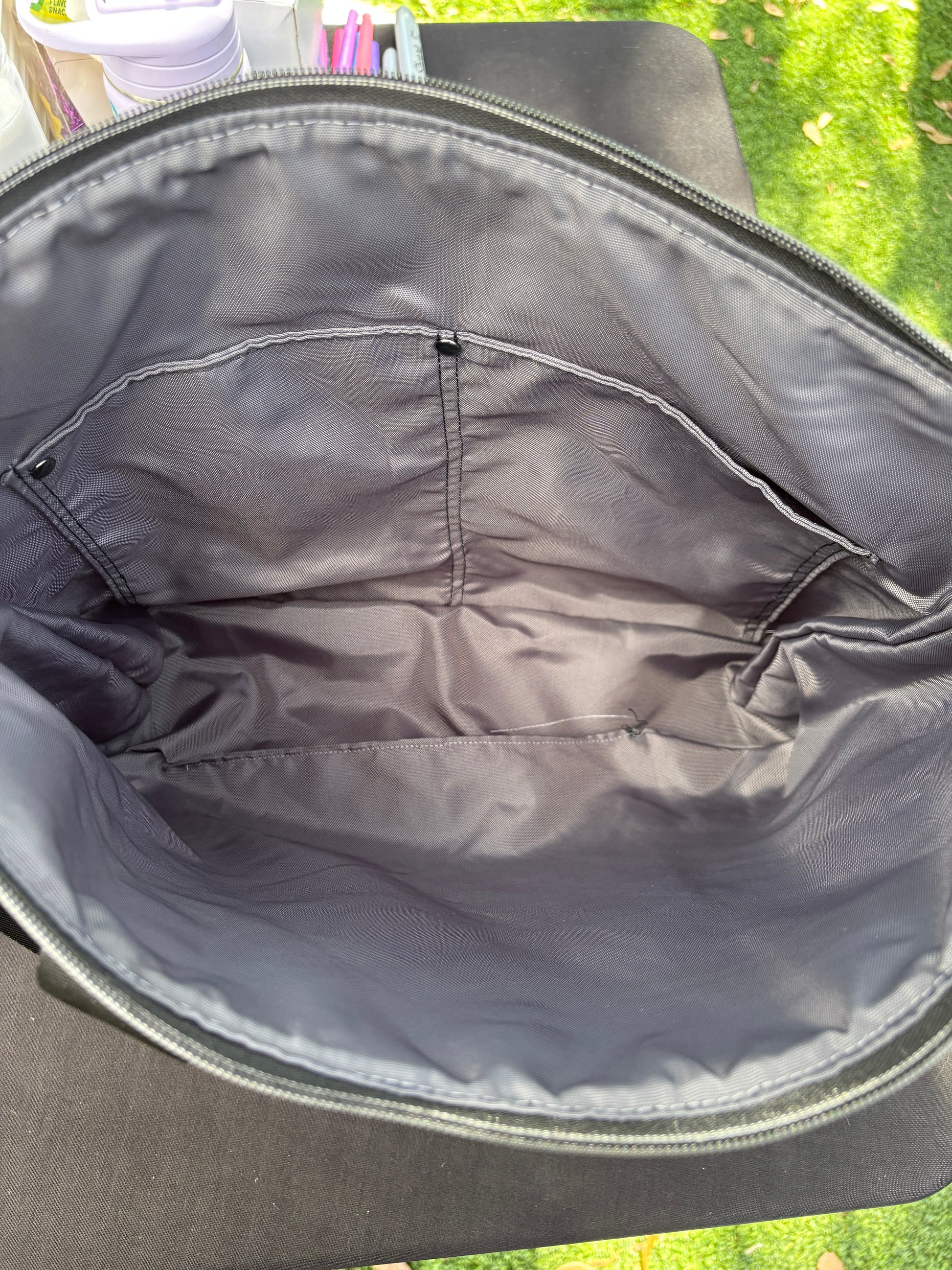 Quilted zippered tote can hold all of your things! Features an interior separated slip pocket and an exterior slip pocket. Water resistant inside and out, simply wipe down with a damp cloth.
